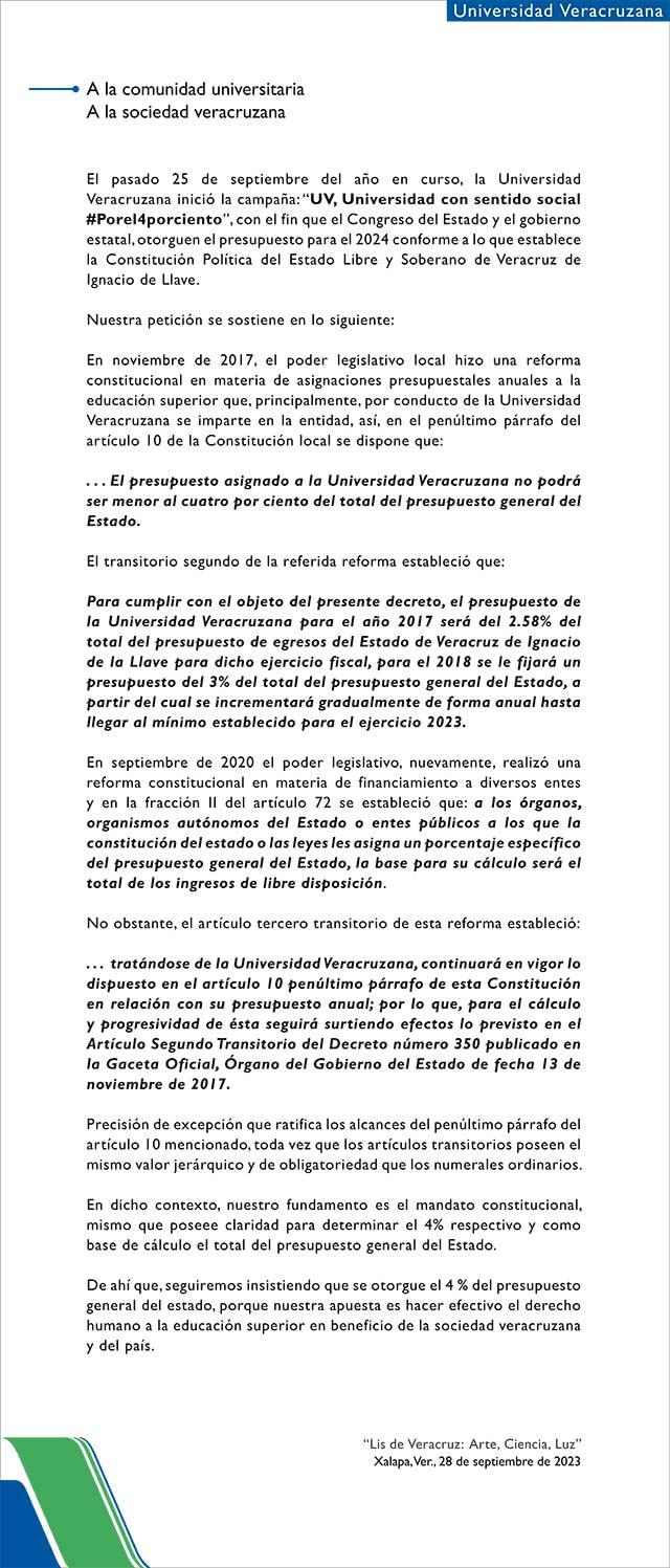 El pasado 25 de septiembre del año en curso, la Universidad Veracruzana inició la campaña: “UV, Universidad con sentido social #Porel4porciento”, con el fin que el Congreso del Estado y el gobierno estatal, otorguen el presupuesto para el 2024 conforme a lo que establece la Constitución Política del Estado Libre y Soberano de Veracruz de Ignacio de Llave.