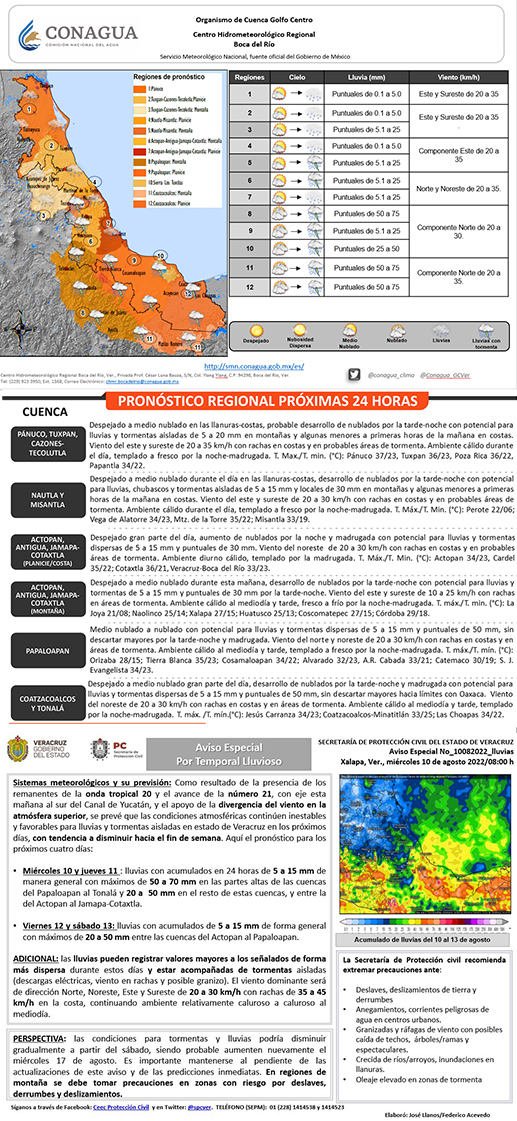 Durante esta jornada y por lo menos hasta el próximo viernes se mantendrá tiempo lluvioso en la mayor parte del Estado de Veracruz con acumulados de mayor importancia de 50 a 70 milímetros en porciones del centro-sur, esto debido a los remanentes de la onda tropical número 20, la presencia de una vaguada en el suroeste del Golfo de México y el avance de la onda número 21 (localizada esta mañana al sur del canal de Yucatán). El ambiente diurno se mantendrá relativamente cálido en montañas con temperaturas máximas de 24-28°C y caluroso de 31 a 36°C en las llanuras y costas con índices de calor elevados de hasta 40°C, el viento del sureste, Este, Norte y Noreste de 20 a 35 kilómetros por hora en costas con rachas mayores de 45 kilómetros por hora en áreas de tormenta.