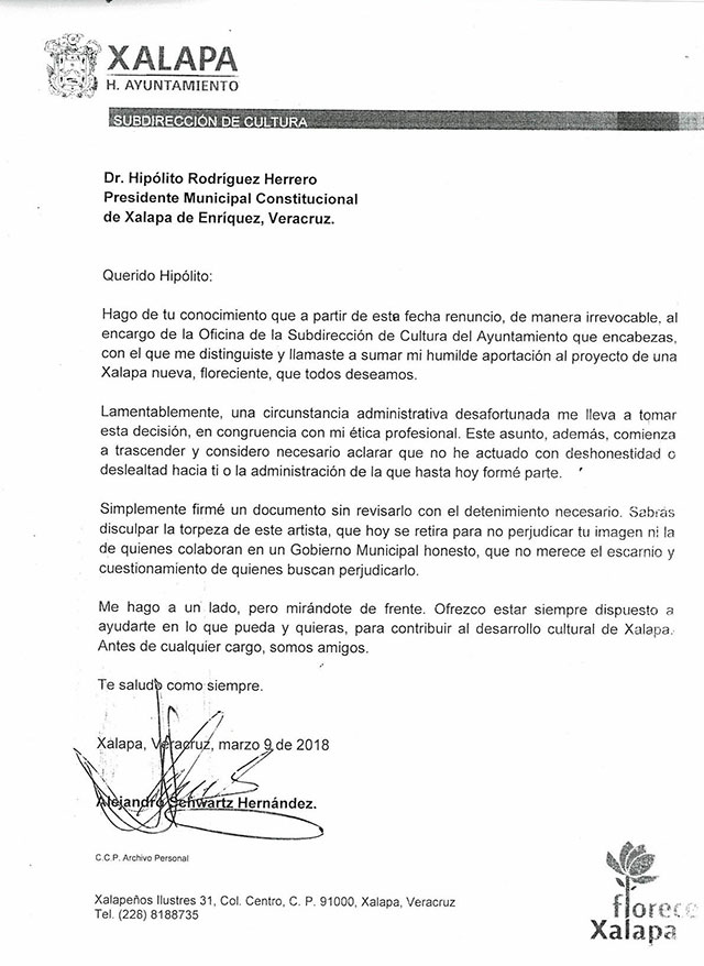 A través de redes sociales el ayuntamiento de Xalapa anunció la renuncia, con carácter de irrevocable, del subdirector de Cultura, Alejandro Schwartz.