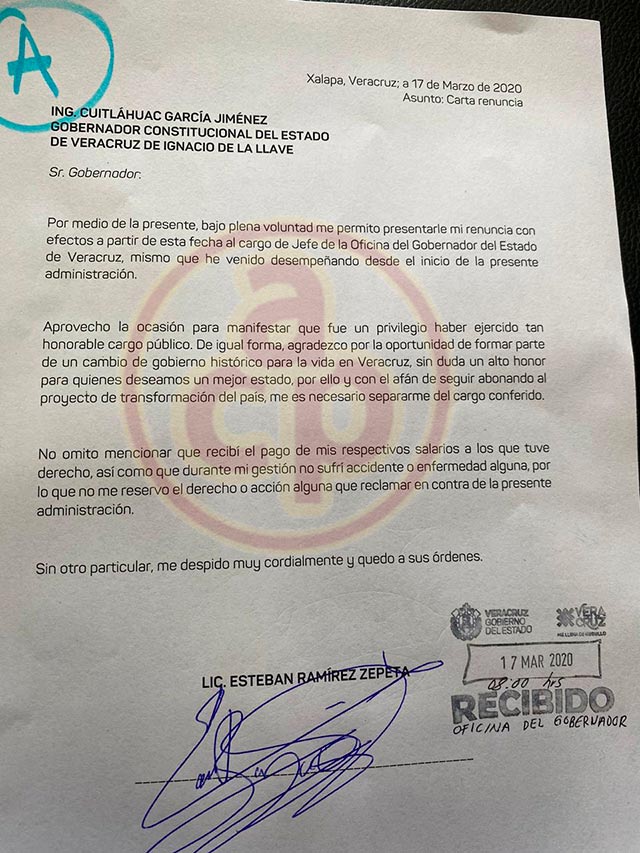 En la carta que envía al Gobernador, Ramírez Zepeta señala que se había desempeñado en el cargo desde el inicio de la administración. En diciembre pasado, se anunció que fungiría como Jefe de Asesores.