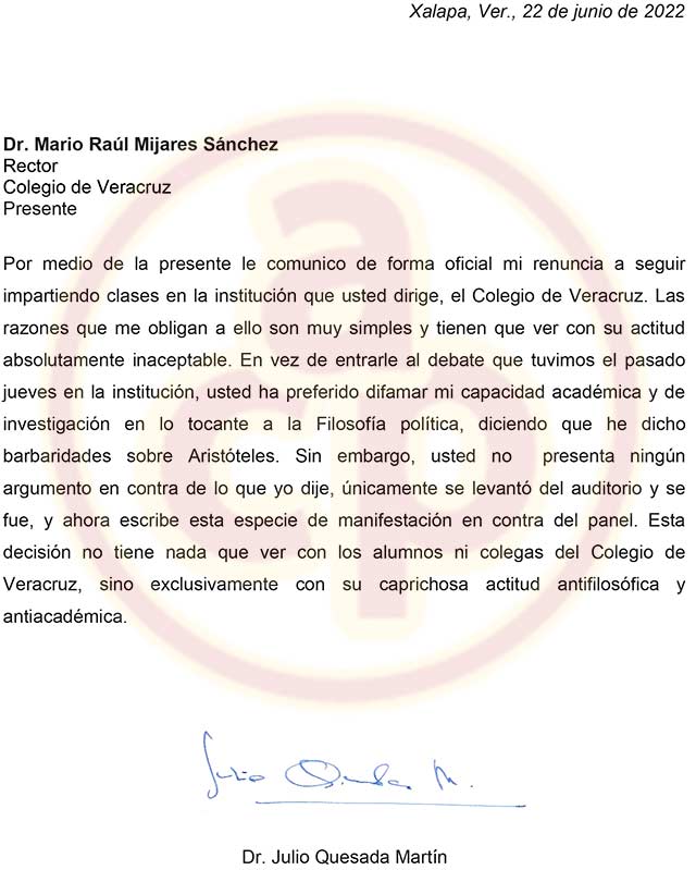 “Las razones que me obligan a ello son muy simples y tienen que ver con su actitud absolutamente inaceptable. En vez de entrarle al debate que tuvimos el pasado jueves en la institución, usted ha preferido difamar mi capacidad académica y de investigación en lo tocante a la Filosofía política, diciendo que he dicho barbaridades sobre Aristóteles”, expuso en la carta de su renuncia, la segunda que se produce recientemente en el COLVER.