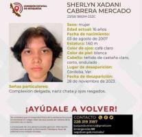Asimismo, de la ciudad de Córdoba, Saraí Martínez Rosas, de 31 años de edad, de oficio enfermera, quien desapareció el 27 de noviembre, mientras que la menor de 16 años de edad Sherlyn Xadani Cabrera Mercado no es vista desde el día 28.