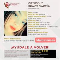 Se trata de Wendoly Bravo García, de 18 años de edad, quien fue reportada como desaparecida ante las instancias ministeriales y organismos de búsqueda y rescate en el estado de Veracruz.