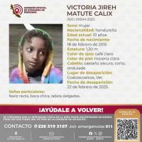 Además, se reportó la desaparición de Victoria Jireh Matute Calix, de 10 años, quien mide 1.20 metros, es de tez morena clara, tiene los ojos color café claro y el cabello corto, ondulado y castaño oscuro. Como señas particulares, tiene la nariz recta, la boca chica y los labios delgados. Cualquier información que ayude a dar con su paradero se pide reportarla al 911 o al 228 319 3187. Hasta el momento, ni el Consulado de Honduras ni las autoridades de Migración se han pronunciado al respecto.