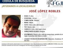 En la Cédula de Búsqueda emitida por la Fiscalía de Zacatecas se menciona que José López tiene 51 años de edad, mide 1.50 metros de estatura, es robusto, quien al momento de su desaparición vestía playera de color verde manga larga, pantalón de mezclilla color negro, huaraches de color blanco y verde.