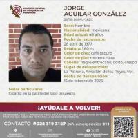 El primer caso corresponde a Jorge Aguilar González, de 48 años de edad, quien fue visto por última vez el 15 de febrero en la comunidad de Guadalupe La Patrona, perteneciente al municipio de Amatlán de los Reyes.