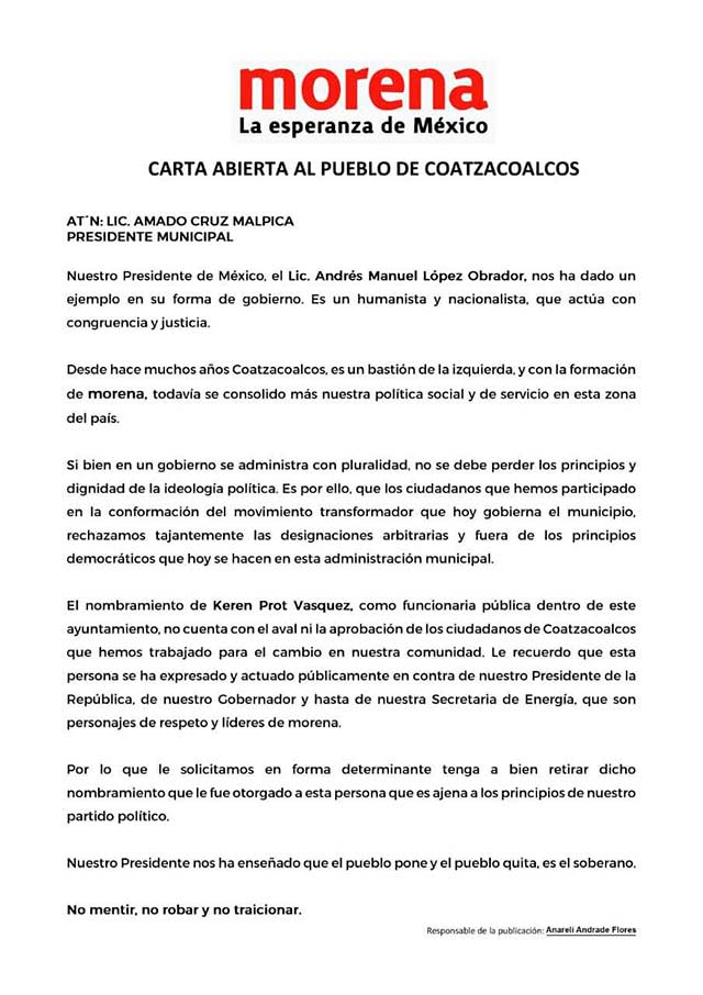 Y es que este miércoles circuló una carta abierta con las siglas del Movimiento de Regeneración Nacional (MORENA), donde se recrimina haberle dado cabido a la priista y se indica que su integración a esta administración municipal no cuenta con el aval, ni la aprobación de los ciudadanos, de ahí la solicitud de pedir que se le retire el nombramiento.
