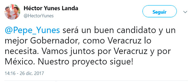 “Pepe Yunes será un buen candidato y un mejor Gobernador, como Veracruz lo necesita. Vamos juntos por Veracruz y por México. ¡Nuestro proyecto sigue!”, publicó el legislador federal en la red social.