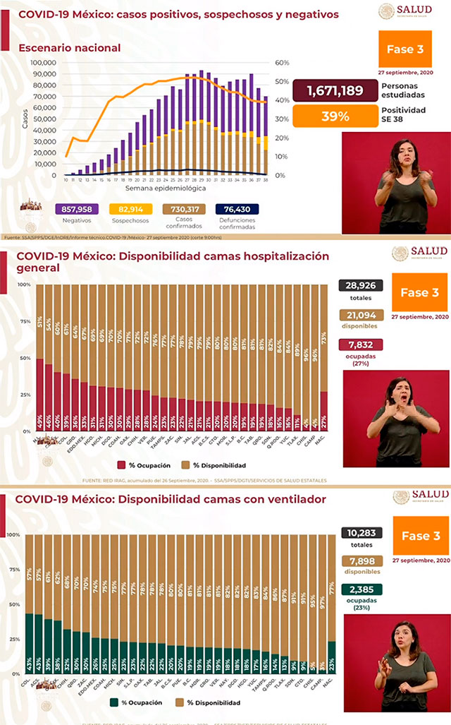 Según las autoridades, actualmente se utilizan en la entidad el 28 por ciento de las camas generales y están disponibles el 72 por ciento. De las camas con ventilador, están ocupadas el 19 por ciento y disponibles el 81 por ciento.
