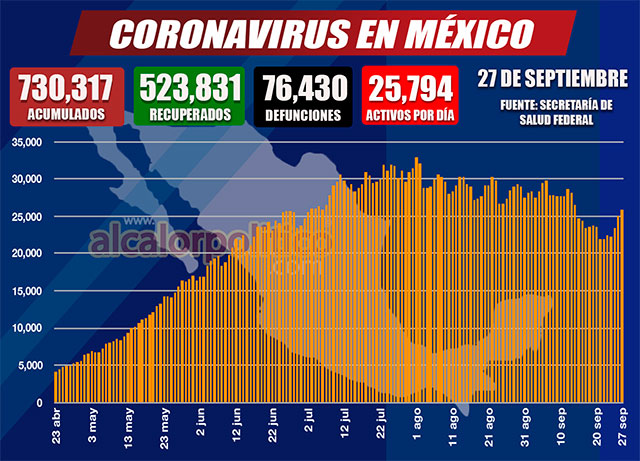 En la conferencia diaria de la Secretaría de Salud para reportar el avance de la pandemia, autoridades informaron que en total, desde el inicio de la contingencia, se han registrado 730 mil 317 contagios confirmados y 76 mil 430 muertes.