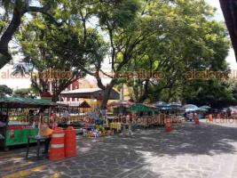 Comerciantes que se instalan en el parque “Miguel Hidalgo”, en Coatepec, fueron movidos a un espacio sobre la calle Aldama, debido a trabajos de rehabilitación.