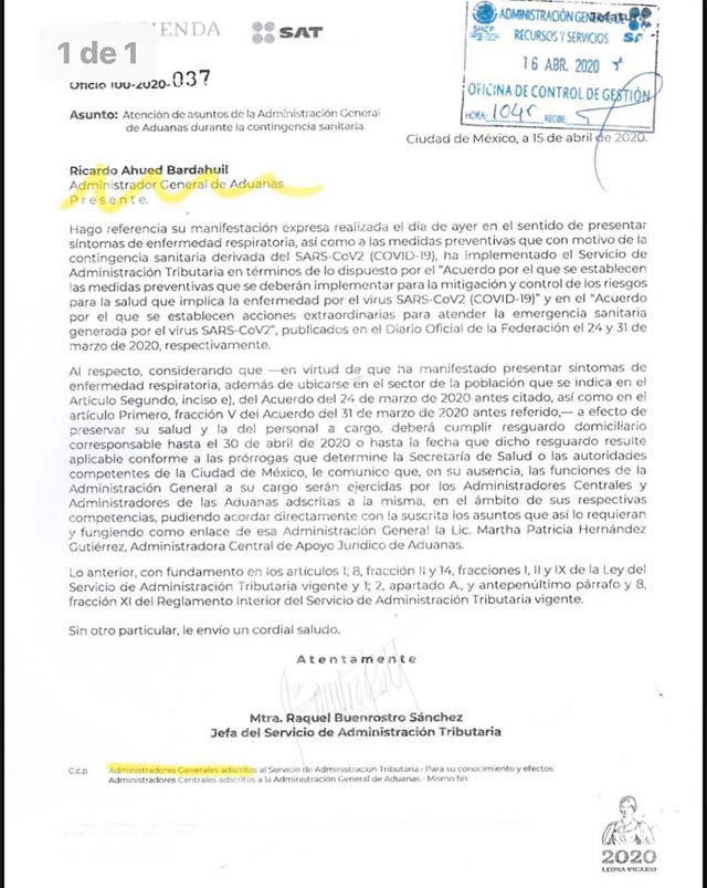 De acuerdo a un oficio firmado por la jefa del Servicio de Administración Tributaria (SAT), Raquel Buenrostro Sánchez, el aún director general de Aduanas, Ricardo Ahued Bardahuil,