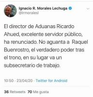“El director de Aduanas Ricardo Ahued, excelente servidor público, ha renunciado. No aguanta a Raquel Buenrostro, el verdadero poder tras el trono, en su lugar va un Subsecretario de Trabajo”, publicó en Twitter el Notario 116 de la Ciudad de México, exprocurador general de la República y exembajador de México en Francia.