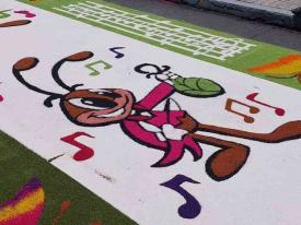 "Estos tapetes son de carácter contemplativo, no es procesional, por eso hacemos muchas alegorías. Son tapetes tipo vitral, con flores, otros tipo talavera y este año quisimos hacer un homenaje a Cri-Cri y colocamos unos grillitos".
