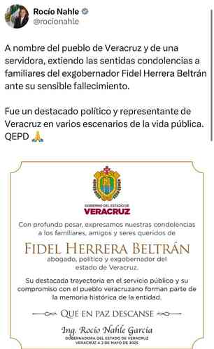La gobernadora del Estado, Rocío Nahle García, expresó sus condolencias por el fallecimiento del exgobernador Fidel Herrera Beltrán, a quien reconoció como un destacado político y representante de Veracruz en la vida pública.