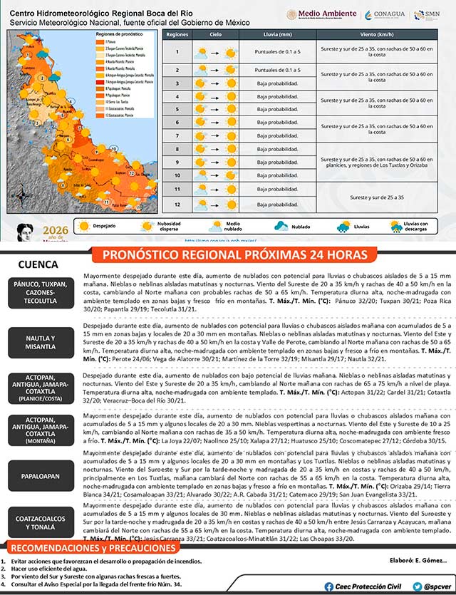 Hoy dominará escasa nubosidad, viento del sur y sureste con algunas rachas frescas en la costa norte, Los Tuxtlas y cuenca baja del Coatzacoalcos, además de ambiente cálido. Finalmente, mañana cambiarían las condiciones del tiempo por la llegada del Frente Frío.