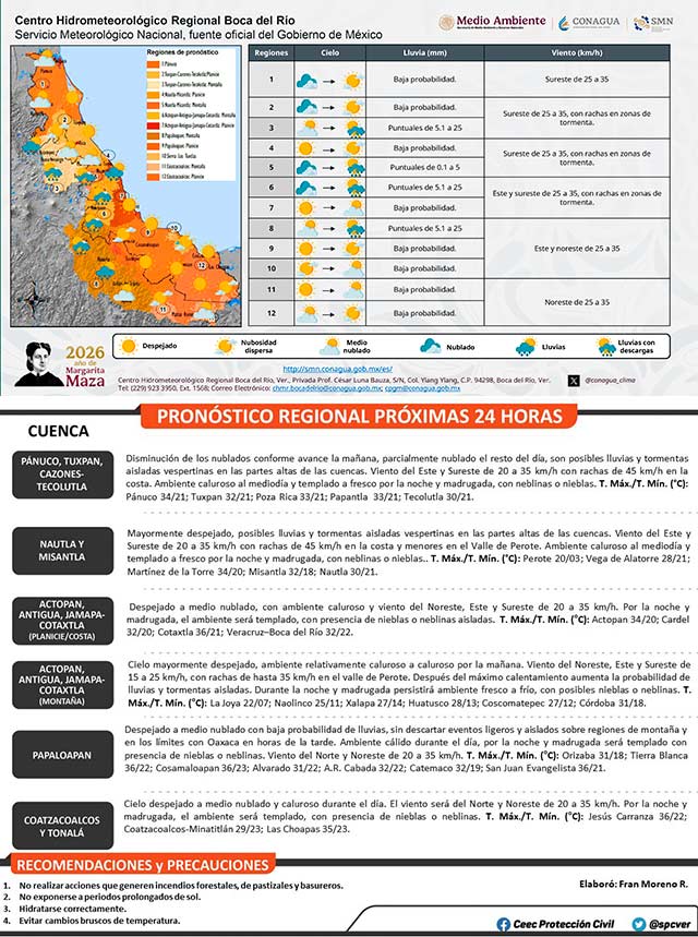 Durante este fin de semana se mantiene caluroso al mediodía y primeras horas de la tarde, después del máximo calentamiento diurno pueden registrarse algunas lluvias con tormentas aisladas en regiones montañosas. Viento del noreste, este y sureste de 20 a 35 kilómetros por hora con rachas en zonas de costa y Valle de Perote.