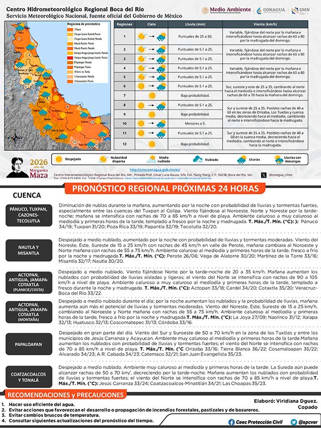 Durante esta jornada se prevén condiciones de tiempo estable, persistirá ambiente caluroso a muy caluroso en Veracruz, con probabilidad baja de lluvia. La surada mantendrá rachas de 50 a 70 kilómetros por hora en sectores del sur, disminuyendo hacia la tarde-noche. Se mantienen las recomendaciones de evitar la exposición prolongada al sol, mantenerse hidratado y no hacer actividades que puedan favorecer la ocurrencia de incendios.
