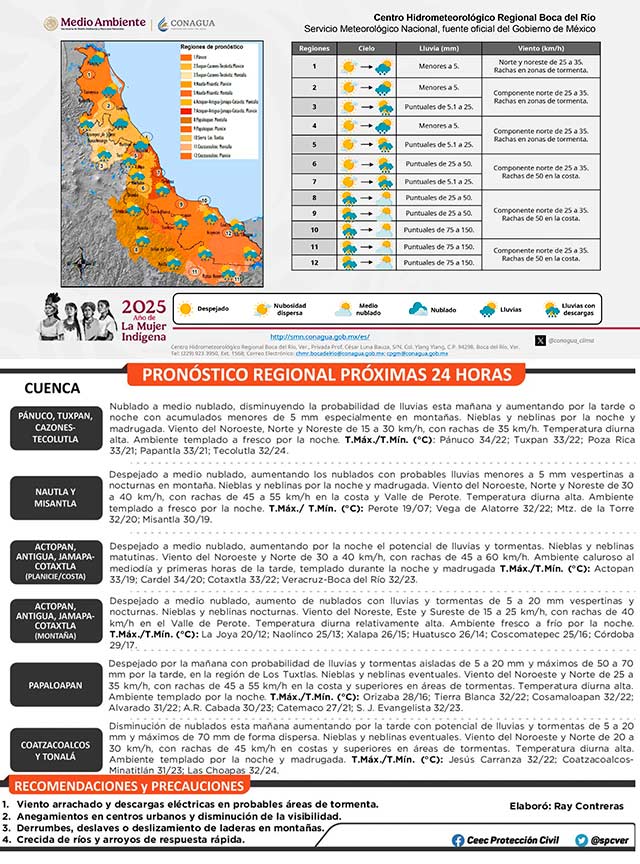 Asimismo se espera que después del máximo calentamiento diurno se presenten condiciones para lluvias y tormentas con acumulados de 5 a 20 milímetros y máximos de 50 a 70 milímetros en regiones montañosas y cuencas del sur del estado, especialmente en región de Los Tuxtlas. Los vientos predominantes serán del noreste y norte con rachas de 40 a 60 kilómetros por hora en la costa central. Las temperaturas diurnas serán elevadas, particularmente en llanuras y costas. Se recomienda tomar precauciones por posibles inundaciones pluviales y fluviales, al igual que al estar al pendiente de las actualizaciones de los pronósticos.