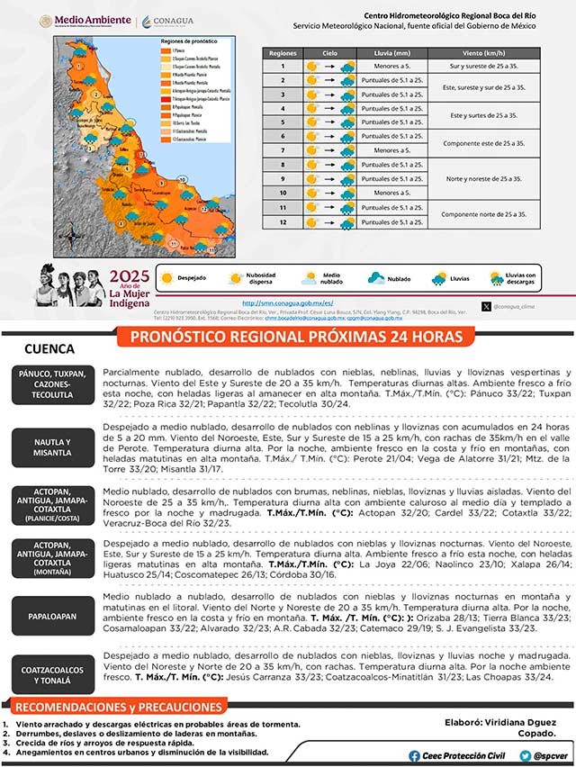 Durante esta jornada, se observa cielo despejado a medio nublado sobre el territorio veracruzano. Se prevé un ligero aumento en la probabilidad de lluvias. Persistirá un ambiente caluroso hacia el mediodía, y fresco a frío durante la noche y madrugada. Viento del noreste, este y sureste de 20 a 35 kilómetros por hora.