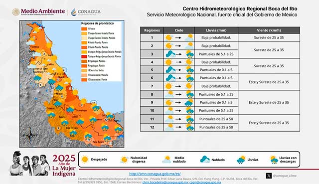 Por otra parte, para este día persistirá el bajo potencial para lluvias y tormentas; sin embargo, se pueden presentar algunos eventos ligeros y aislados en regiones de montaña y nuevamente en cuencas del sur. Persiste ambiente caluroso al mediodía y primeras horas de la tarde en gran parte de la entidad. Viento del este, sureste y noreste de 20 a 35 kilómetros por hora en la costa con rachas en áreas de tormenta.