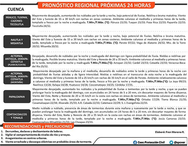 Si bien el potencial de lluvias ha disminuido se recomienda vigilar su entorno en regiones de montaña ante derrumbes, deslaves o deslizamientos de ladera; además del comportamiento de niveles de ríos y arroyos.