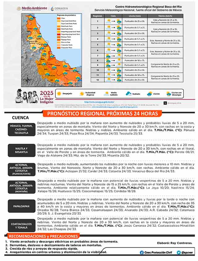 Lunes 15: El potencial de lluvias y tormentas se generaliza en el estado. Acumulados de 5 a 20 milímetros en promedio en la entidad con máximos de 50 a 70 milímetros en la cuenca del Cazones al Colipa y Jamapa-Cotaxtla al Papaloapan y de 20 a 50 milímetros en el resto de las cuencas, sin descartar mayores. Viento del norte y noreste de 20 a 40 kilómetros por hora y mayores en áreas de tormentas. Los valores de la temperatura máxima disminuyen ligeramente en comparación al día anterior. Oleaje de 0.5 a 1.0 metros cerca de la costa.