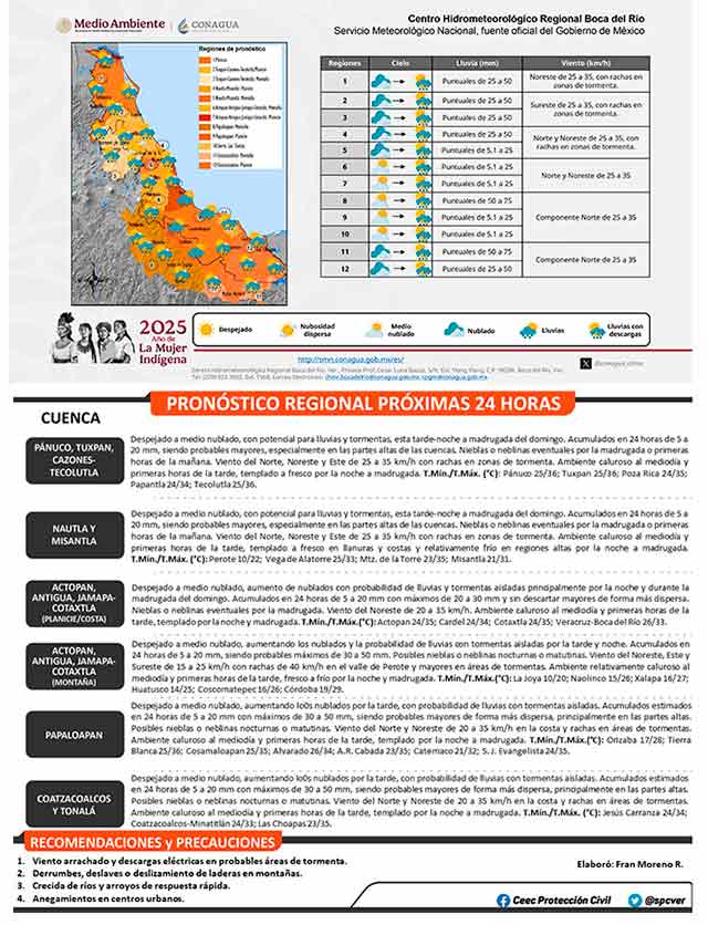 Se recomienda extremar precauciones por viento arrachado, descargas eléctricas y granizadas en zonas de tormenta, así com anegamientos en centros urbanos, crecida de ríos y arroyos de respuesta rápida, además de derrumbres, deslaves y deslizamientos en regiones montañosas. Consulete el Aviso Especial por temporal lluvioso.