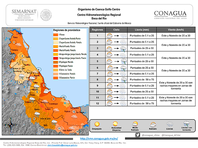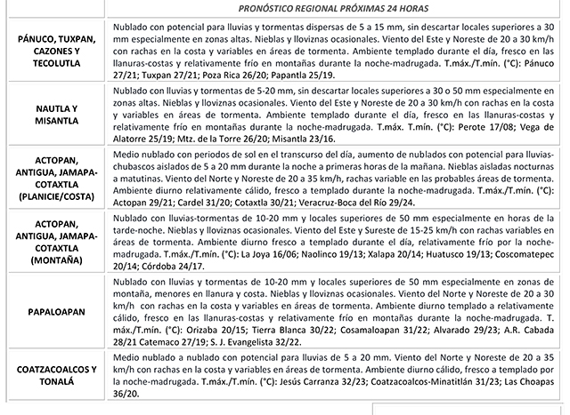 El lento desplazamiento del Frente Frío 47 sobre el Golfo de México, el escurrimiento de aire frío asociado y la persistencia de una vaguada en el suroeste del mismo Golfo mantendrán durante este fin de semana condiciones de tiempo inestable con lluvias moderadas a ocasionalmente fuertes, mismas que podrían estar acompañadas por actividad de tormenta especialmente en regiones montañosas de Veracruz y estados vecinos, lluvias de menor intensidad en las llanuras y costas, disminuyendo muy lentamente el potencial de lluvias a partir de mañana, especialmente en zonas bajas, el viento persistirá de dirección Noreste moderado a fresco y ambiente diurno templado a relativamente cálido.