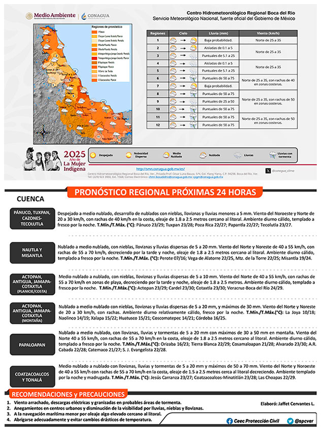 Sábado 10: nublado a medio nublado con lluvias y tormentas aisladas. Acumulados en 24 horas de 5 a 15 milímetros de forma general con máximos de 30 a 50 milímetros entre las cuencas del Papaloapan al Tonalá, siendo probables del orden a 70 milímetros especialmente en zonas montañosas de estas cuencas de forma dispersa y de 20 a 30 milímetros en la y región montañosa central. Viento del norte con velocidades de 45 a 55 kilómetros por hora con rachas de 55 a 70 kilómetros por hora en la costa centro y sur y menores en la costa norte, decreciendo. Oleaje de 2.0 a 3.0 milímetros en la costa centro y sur y de 1.0 a 2.0 metros en la costa norte. Ambiente templado a relativamente caluroso al mediodía.