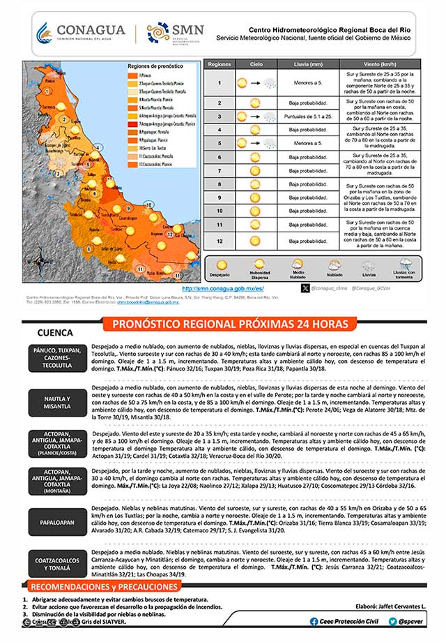 Pronóstico para el estado de Veracruz: Para este día el potencial para lluvia será bajo, la temperatura máxima aumentará en comparación al día de ayer, persistirá la surada con rachas máximas de 45 a 60 kilómetros por hora en las regiones típicas. Entre el domingo 19 y el miércoles 22 aumentarán el potencial para lluvias, se estiman valores máximos de 30 a 50 milímetros en sectores del norte y sur para el domingo 19, y de 70 a 100 milímetros en la zona sur entre lunes 20 y miércoles 22, sin descartar mayores. Durante este periodo presenciaremos un evento de “norte” prolongado en litoral veracruzano; domingo 19 se esperan rachas máximas de 85 a 100 kilómetros por hora en costas del norte y centro y de 75 a 90 kilómetros por hora en la sur, menores en montañas, y oleaje de 2 a 3 metros, y para el martes 21 las rachas en la costa central pudieran alcanzar 100 a 115 kilómetros por hora (ver tabla) y oleaje de 3 a 6 metros, evento que pudiera extenderse a la región entre Xalapa-Naolinco-Misantla y valle de Perote con rachas de 45 a 60 kilómetros por hora. Se espera un marcado descenso de temperatura entre lunes y viernes de la semana próxima.