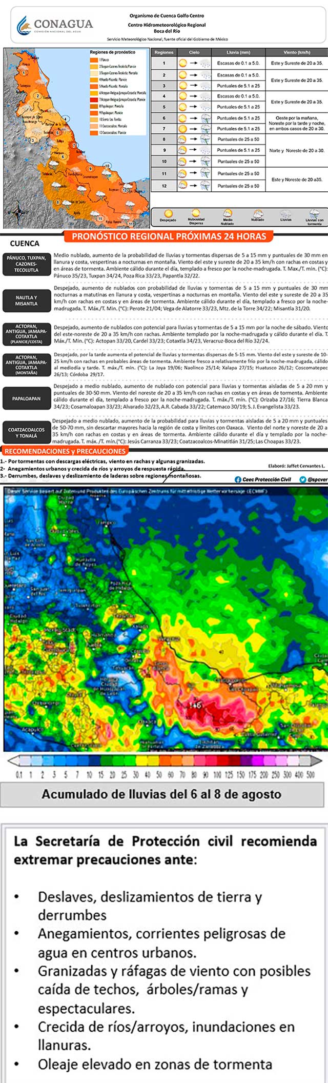 En Veracruz amanece con cielo despejado a medio nublado, sin descargar chubascos dispersos en áreas del extremo Norte y Sur, además se prevé incremente la probabilidad de lluvias y tormentas dispersas, se estiman acumulados de 5-20 milímetros y puntuales de 30 a 50 milímetros sin descartar mayores a 70 milímetros en especial en cuencas del sur; las temperaturas diurnas serán altas, se estiman máximas de 30-35°C, mayor sensación de calor en llanuras y costas, mientras en montañas máximas de 25-29°C; el viento del Noreste y Este de 5-15 kilómetros por hora con rachas de 25-35 kilómetros por hora por la tarde en el litoral y en áreas de tormenta.