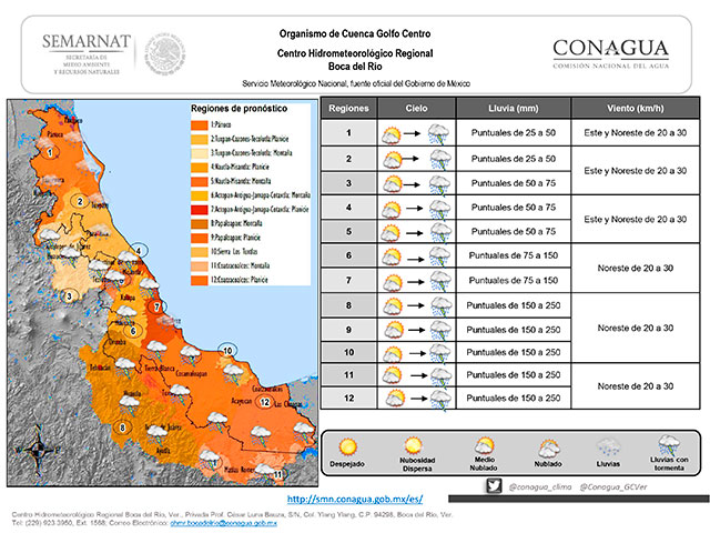 La persistente vaguada en el suroeste del Golfo de México y el avance de la onda tropical No. 13 sobre la región Ístmica de Tehuantepec y sur del país, aunado con un patrón de divergencia en la atmósfera alta mantendrán las condiciones de tiempo inestable con potencial para lluvias en la mayor parte del Estado de Veracruz durante este fin de semana, estimando de moderadas a fuertes en regiones del Sur, Costa central, en montañas y menores en el resto de la entidad.