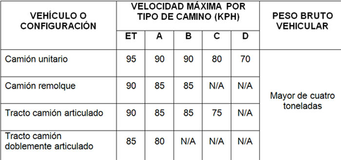 El límite máximo de velocidad a la que podrán transitar los vehículos o configuraciones vehiculares referidos en la presente circular, según el tipo de camino, aún cuando los señalamientos viales establezcan velocidades superiores, serán las siguientes: