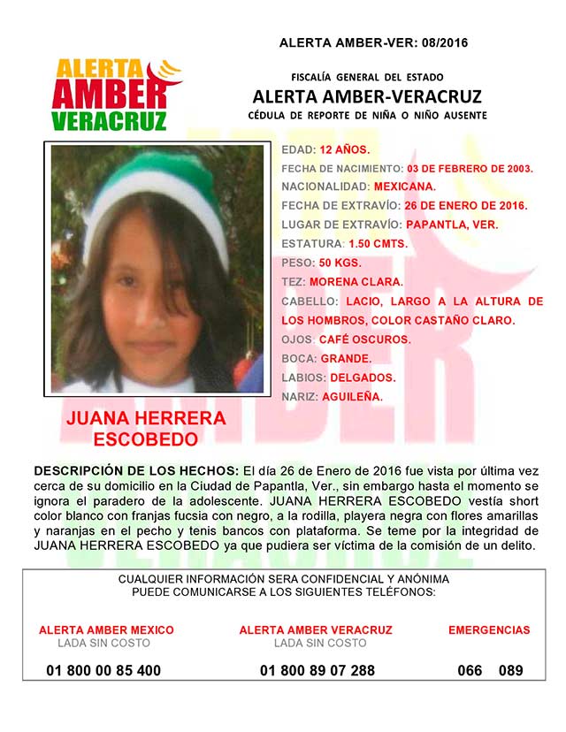 Se activa Alerta Amber para localizar a Juana Herrera Escobedo, de 12 años de edad