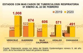 En el Estado de Veracruz, los casos de tuberculosis respiratoria se incrementaron en 226.2 por ciento y ocupa ahora el primer lugar nacional en esta enfermedad, con mil ocho personas diagnosticadas del 1° de enero al 22 de febrero del año en curso, mucho más que los 309 registrados en el mismo periodo del 2019.
