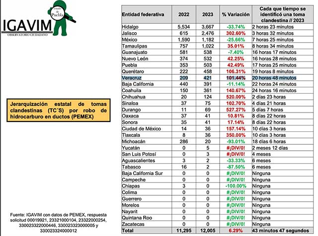 De 2022 a 2023 se duplicó el número de tomas clandestinas de hidrocarburo en el estado de Veracruz, al aumentar de 209 a 421, exhibió el Instituto para la Gestión, Administración y Vinculación Municipal (IGAVIM).