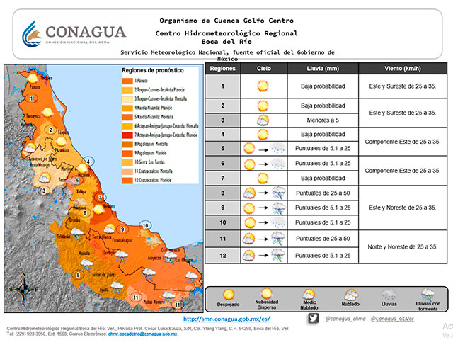 Por su parte, el viento se continuará del Sur y Sureste en Tamaulipas, con velocidades de 25 a 35 km/h y con rachas de 50 km/h durante horas de la tarde y noche en las zonas del norte y centro del estado. En Veracruz dominará de componente Este de 25 a 35 km/h. Es posible que en zonas de tormenta se presenten algunas rachas.