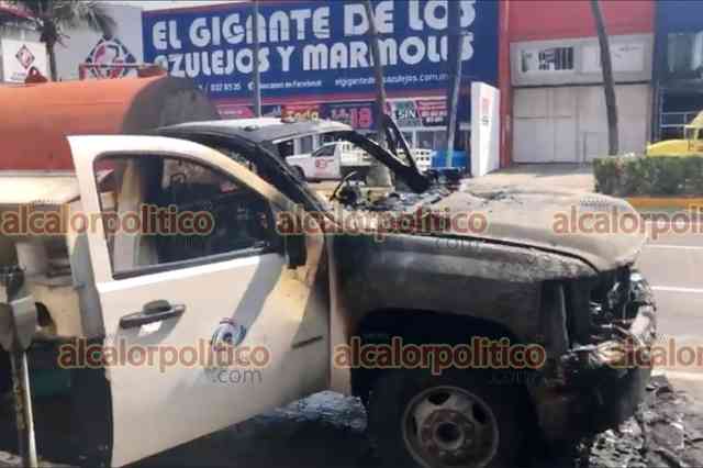 Veracruz Ver., 24 de mayo 2023.- Un cortocircuito, ocasionó que una pipa transportadora de abono se incendiara sobre la avenida Allende. Las llamas sorprendieron a los ocupantes quienes resultaron ilesos; bomberos municipales llegaron para controlar el fuego.