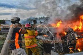 Atrás iba un tractocamión tipo plana, que no pudo frenar y se impactó por alcance, provocando el incendio.