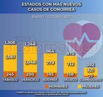 Datos de la Dirección de Epidemiología de la Secretaría de Salud del Gobierno Federal, indican que los Estados del sureste de la República Mexicana, Tabasco y Veracruz, son los primeros del país en nuevos casos de Gonorrea o Infección Gonocócica del tracto Genitourinario, con mil 306 y mil 248 personas diagnosticadas con esta enfermedad respectivamente.