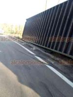 Dicha unidad llevaba un contenedor de metal sobre la plataforma, pero al tomar la curva del entronque del kilómetro 13.5 hacia autopista, se vencieron los seguros de metal y el contenedor se volcó, quedando a la orilla de la carpeta de rodamiento.