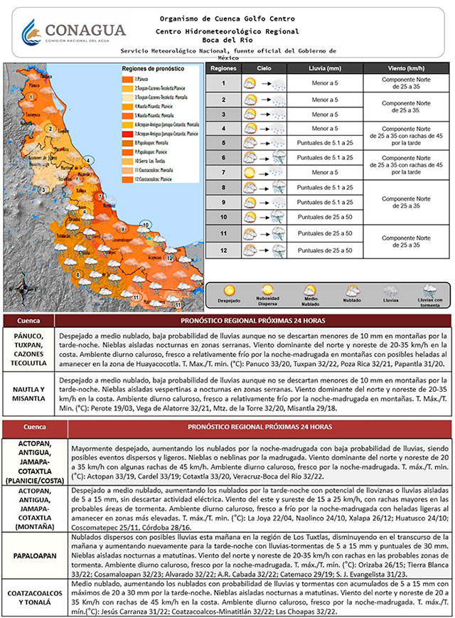 Sobre el Golfo de México domina un sistema de alta presión y la onde tropical número 42 está cruzando su eje sobre el Istmo de Tehuantepec. Para el Estado de Veracruz se prevé un ambiente diurno cálido con altas temperaturas e índices de calor elevados en llanura y costa, mientras que por la noche-madrugada se tornaría relativamente frío en montañas con posibles heladas ligeras al amanecer en áreas de mayor elevación.