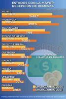 Estas 10 entidades federativas recibieron de enero a junio del año en curso 14 mil 451.6 millones de dólares, monto que representa el 61.1 por ciento de los 23 mil 618.3 millones de dólares que se recibieron en el país durante el primer semestre de este 2021.