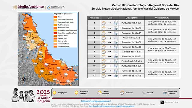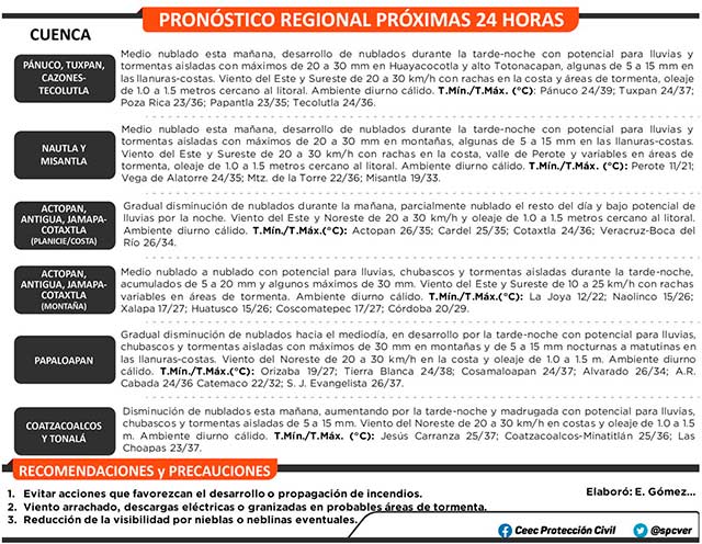 Se prevé gradual disminución de nublados durante esta mañana; sin embargo, aumentarían por la tarde-noche con potencial para lluvias, chubascos o tormentas aisladas con máximos de 20 a 30 milímetros sobre regiones de montaña y algunas lluvias menores de 5 a 15 milímetros por la noche a primeras horas de la mañana en las llanuras y costas, siendo probable aumente el potencial de lluvias mañana viernes como resultados del fortalecimiento de una vaguada ubicada en el suroeste del Golfo de México por la llegada de un frente frío al norte del Golfo de México y el avance de una onda tropical sobre y al sur de la Península de Yucatán.