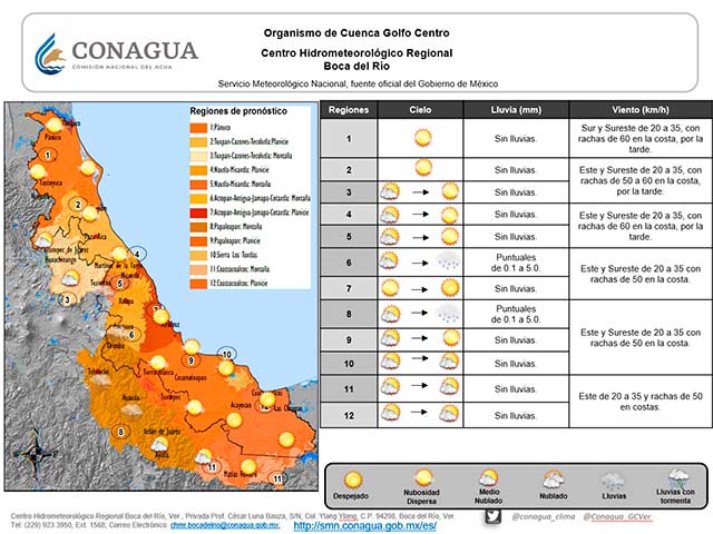 El viento dominará del Sur de 30 a 40 km/h en Tamaulipas con rachas de 60 a 70 km/h en la porción norte y centro; mientras que sobre el Estado veracruzano será del Este y Sureste de 20 a 35 km/h con rachas de 60 km/h en la costa norte y de 50 km/h en costas del centro y sur.