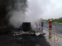 En minutos el fuego se extendió por todo el tractor, reduciendo la cabina a cenizas. Luego de varios minutos el incendio fue sofocado por los Bomberos quedando sólo chatarra del tráiler siniestrado.