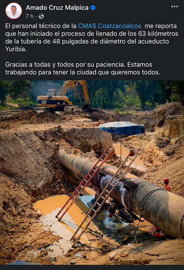 Al respecto, el alcalde de Coatzacoalcos, Amado Cruz Malpica, informó que desde la noche del martes iniciaron los trabajos de llenado de los 63 kilómetros de tubería.