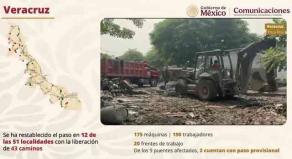 “En el caso de Veracruz, se ha restablecido el paso en 12 de las 51 localidades con la liberación de 43 caminos, 175 máquinas, casi 200 trabajadores, 20 frentes de trabajo”, detalló.