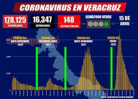 Del 18 de abril al 1 de mayo, Veracruz se mantiene en color verde (riesgo bajo) a nivel nacional; en la entidad, 4 municipios –La Antigua, Paso de Ovejas, Úrsulo Galván y Veracruz– están en naranja (alto), 29 en amarillo (medio) y 179 en verde.